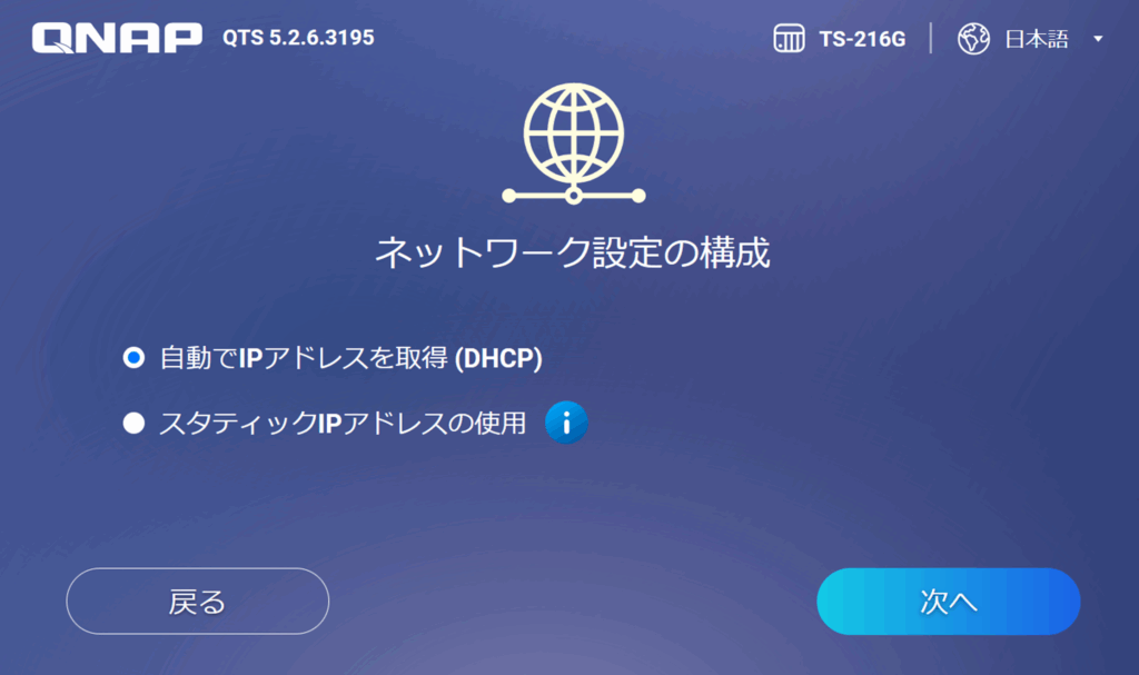 自動でIPアドレスを取得(DHCP)か、スタティックIPアドレスの使用、にするか選べる。筆者はIPアドレスの固定はルーター側でやることとした。IPアドレスがころころ変わると困る場合はスタティックIPアドレスを選ぶ方法もあるが、とりあえず後からいくらでも変えられるので標準のDHCPでいいだろう。