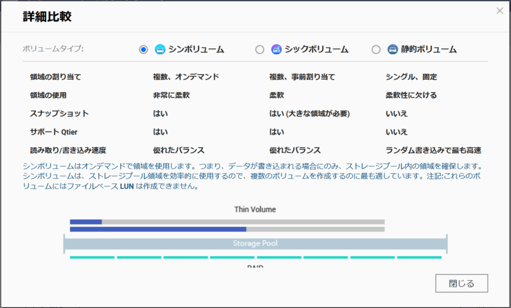 特段の事情(例:極端なパフォーマンス重視、レガシー環境との互換性など)がない限り、QNAP NASにおいてはシンボリュームの選択が最も合理的である。容量効率、機能対応、運用柔軟性のいずれにおいても優れており、現代的なNAS運用における標準構成と位置づけられる。