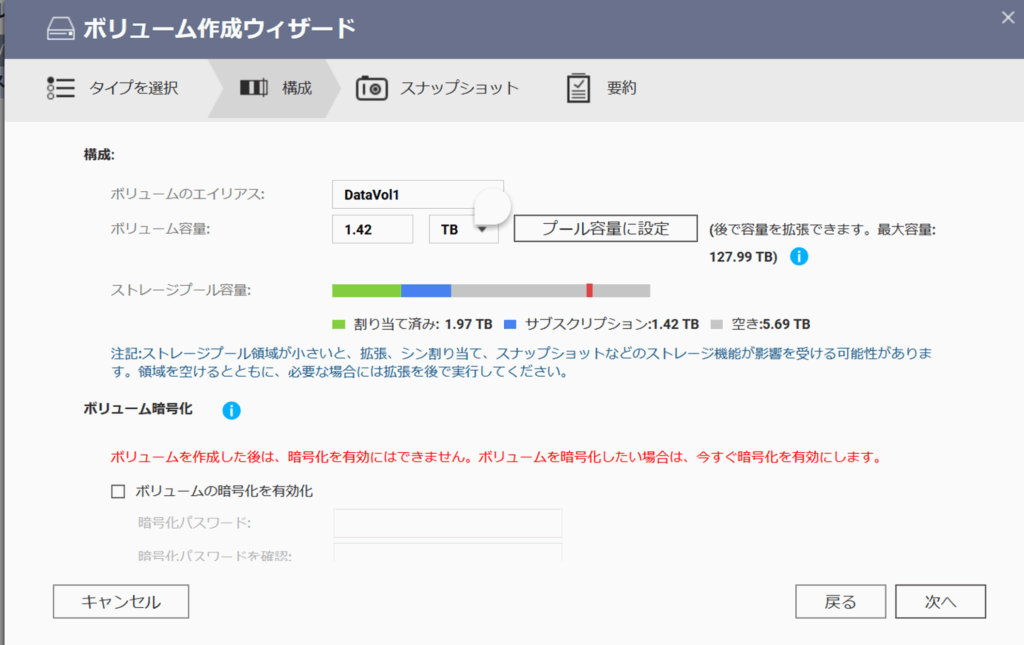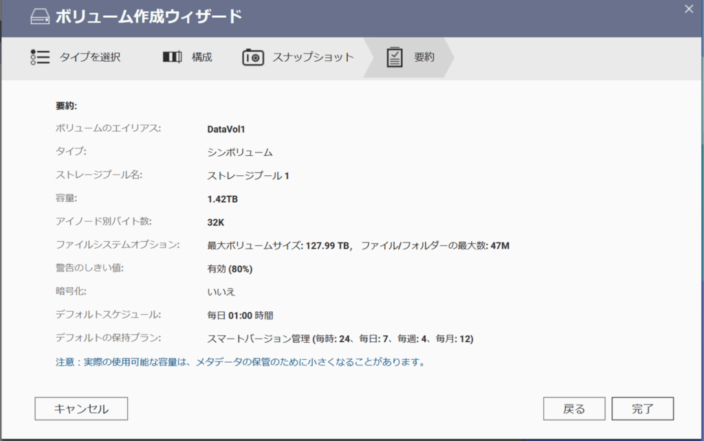 筆者は何も考えず、デフォルト値を使用してしまったのだが、保存するデータの容量が決まっている場合、たとえば3TBなら、ボリュームの容量を4TB以上にすることをオススメする。そうしないとデータ格納の際に容量不足でビープ音連発になりかねない。とりあえず10TBのHDDでNASを設定するのにボリュームの容量が1.42TBということはないだろう。