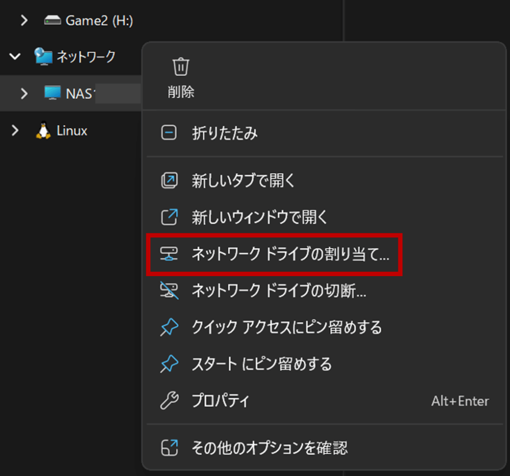 ドライブレターを割り当てることで、NAS上の共有フォルダが「Z:」「Y:」などのローカルドライブとして認識される。これにより、エクスプローラーや各種アプリケーションからのアクセスが容易になり、パスの入力やネットワーク経由の煩雑な操作を省略できる。