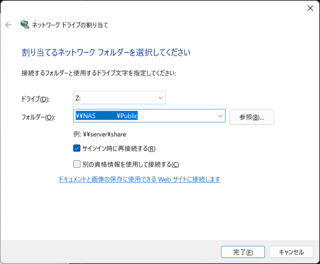 使用したいドライブレターを選択し、「フォルダー」欄にNASの共有フォルダのパス(例:¥¥NAS名¥共有名)を入力する。「再接続時に接続する」にチェックを入れ、必要に応じて資格情報を保存する。