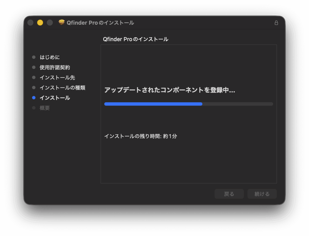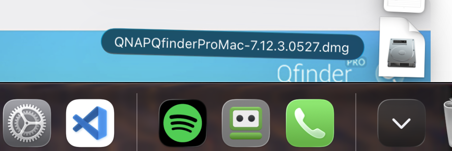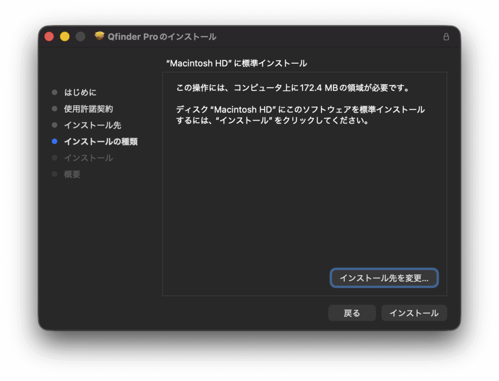 ダウンロードした .dmg ファイルを開き、表示されるインストーラーアイコンをクリックする。これにより、Qfinder ProがMacにインストールされる。