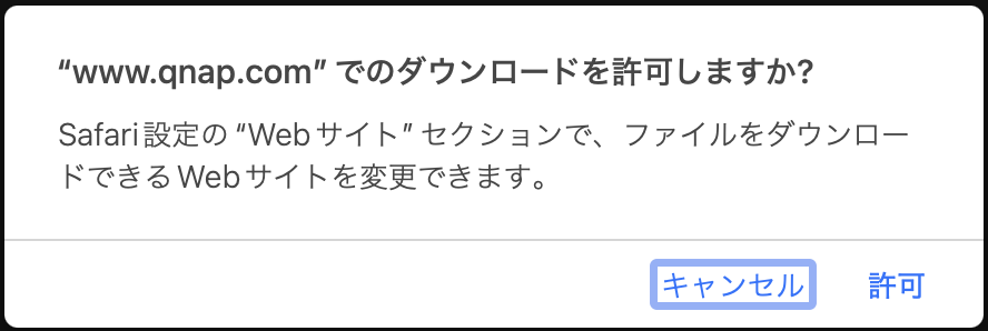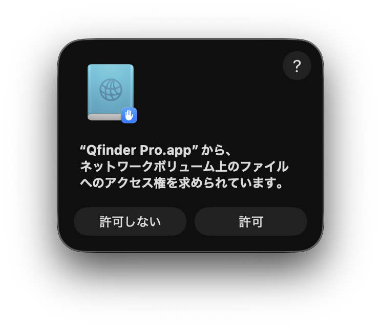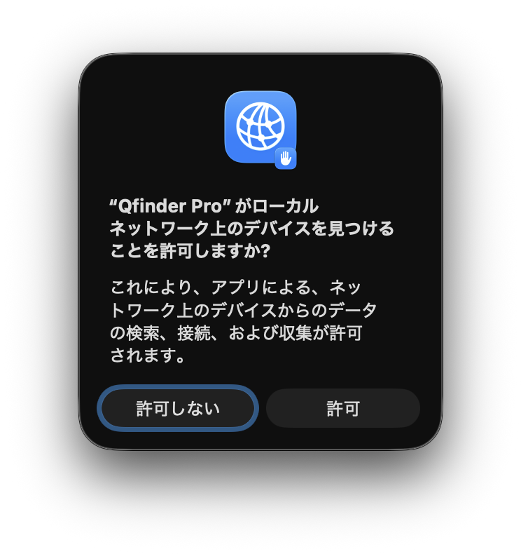 Qfinder ProはLAN上のNASを検出するため、macOSのファイアウォールやネットワークアクセス権限の許可が必要である。起動時に表示されるアクセス要求には「許可」を選択する。このダイアログで許可をしないと後から設定は相当面倒で、最悪再インストールで解決する方が早い。必ず許可を選びたい。