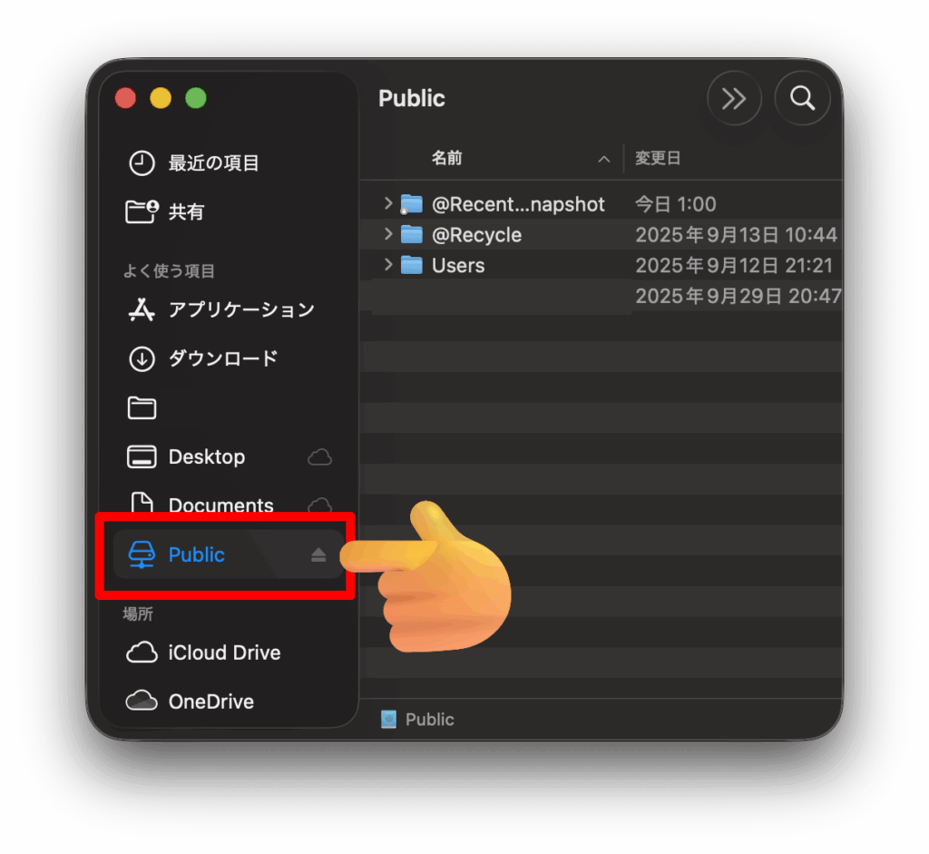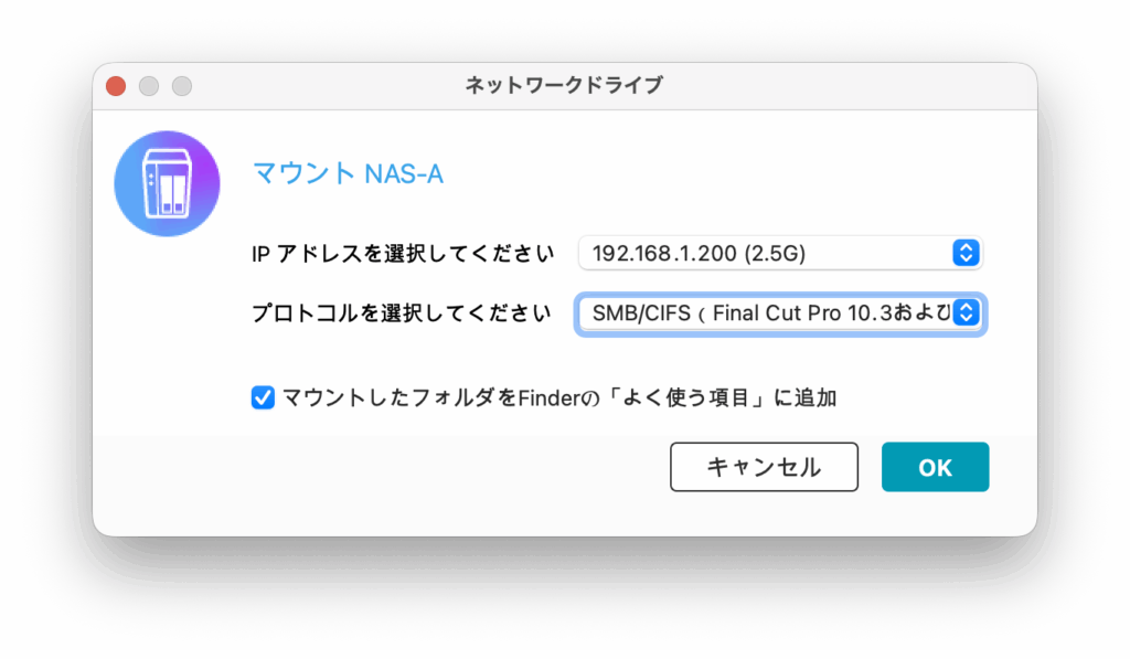 • Finderで smb://[NASのIP]/Public などの共有フォルダにアクセスできること