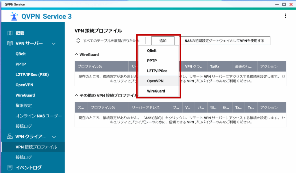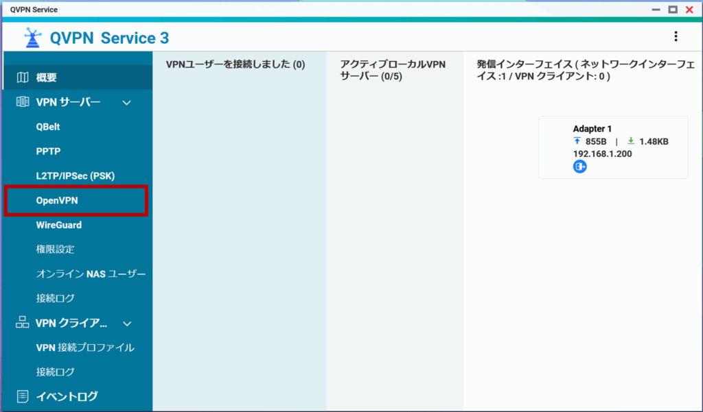 QVPN Serviceを開き、今回はOpenVPNを設定する。