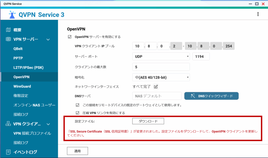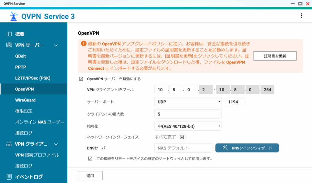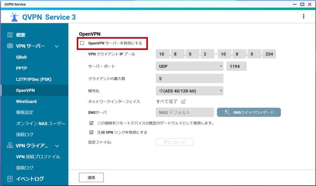 • OpenVPNがQVPN Service内で有効化されていること