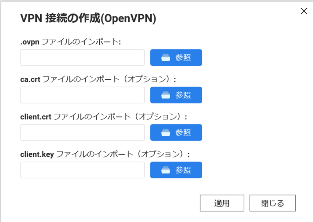 QNAPのOpenVPNは、TLS認証(証明書ベース)を使用しており、以下の3つのファイルが必要である。