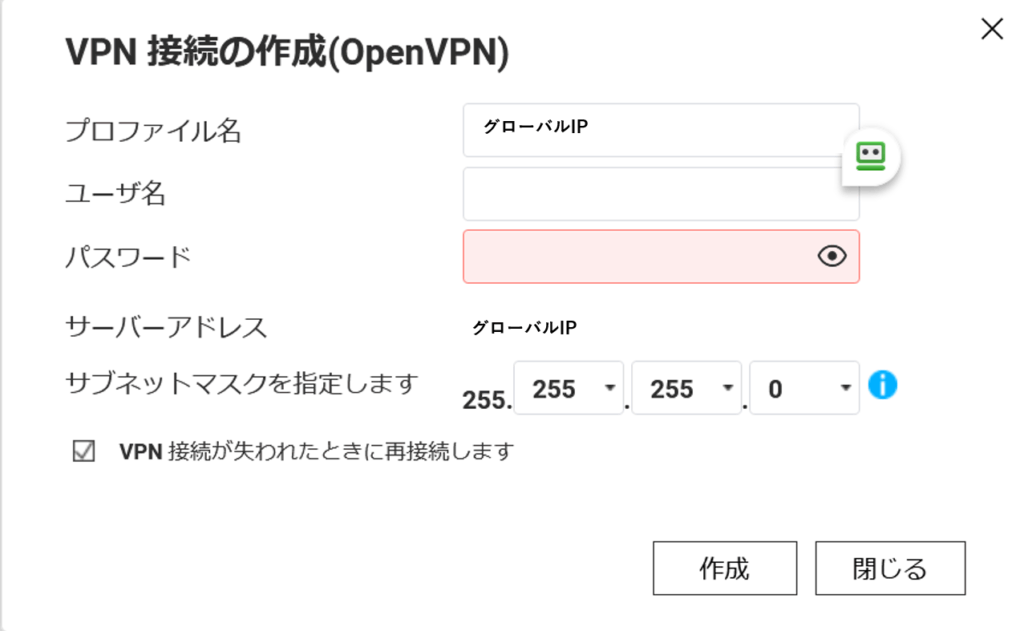 NASがある自宅のグローバルIPアドレスがセットされる。ここで、VPN接続用のユーザー権限としてユーザ名とパスワードを設定する。