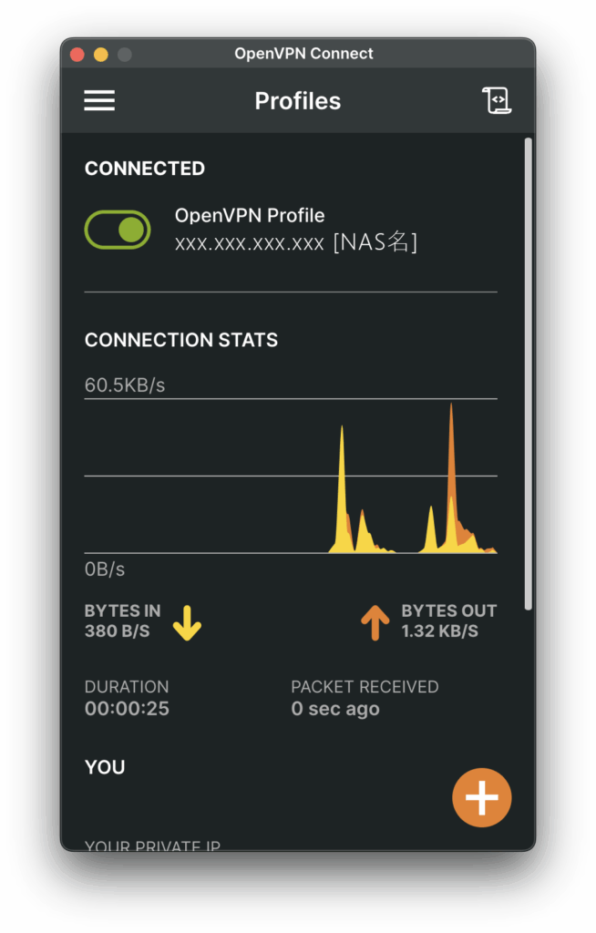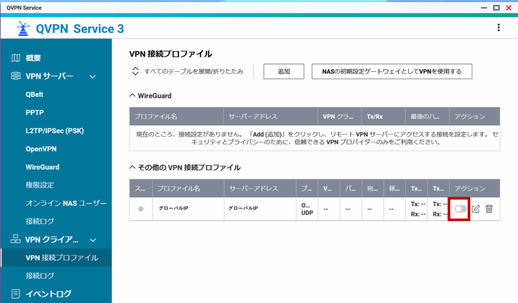 設定プロファイルが読み込まれたら、項目としてグローバルIPアドレス[NAS名]が表示される。このプロファイルから、自宅内ルーター配線下のグローバルIPの範囲外、外出先での外側からのグローバルIPアドレスを持ったインターネット環境に接続する。