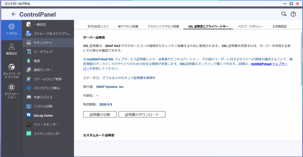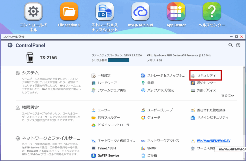 QTSのコントロールパネルからセキュリティを選択。