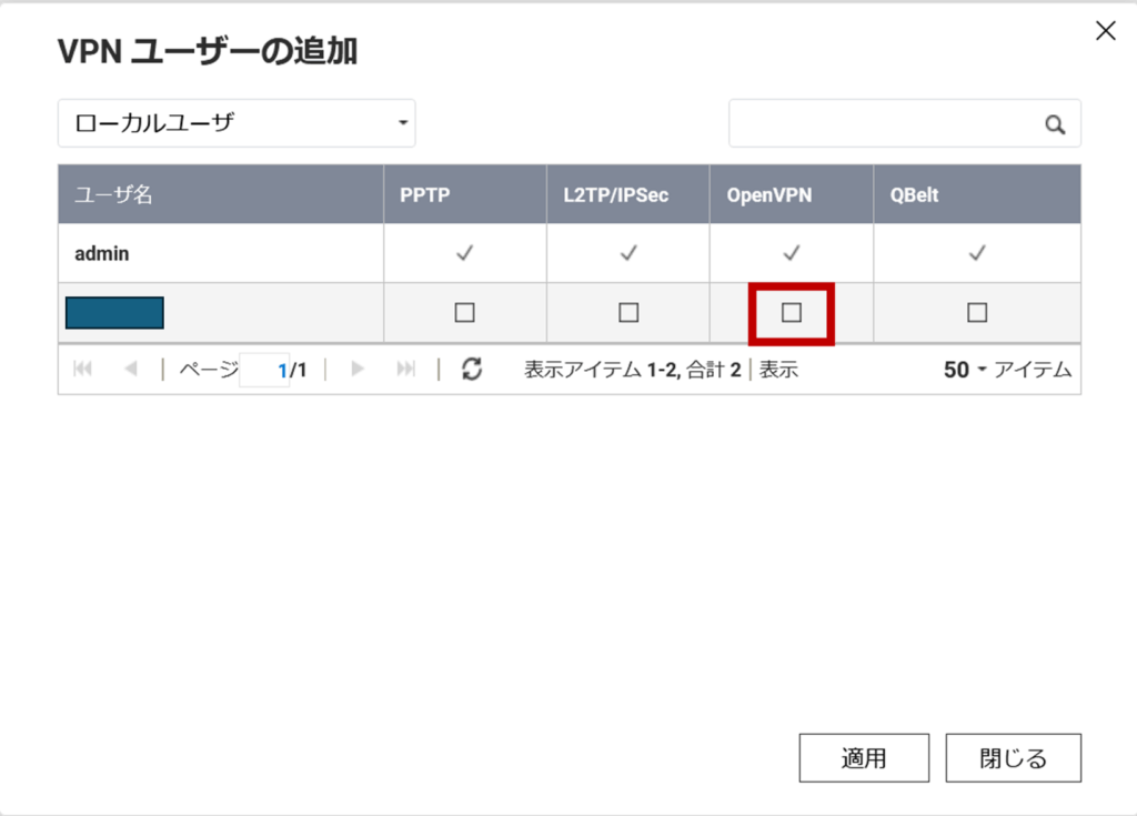 OpenVPNの項目のチェックボックスにチェックを入れる。適用を押す。これをやらないと詰むので権限を付けるのを絶対に忘れないようにしよう。