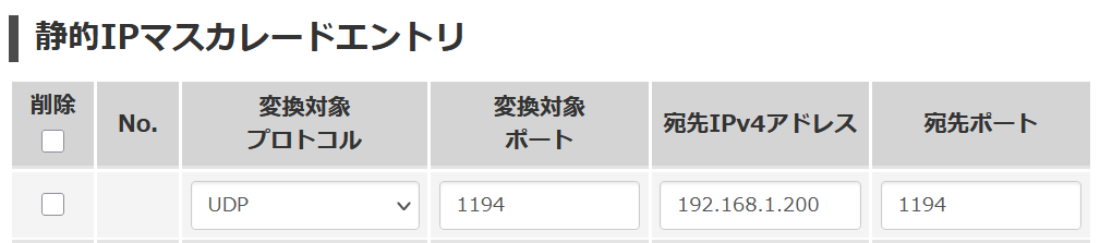 変換対象ポート1194外部からの接続ポート(OpenVPNのデフォルト)