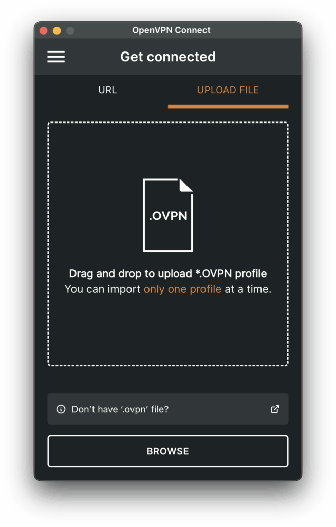 OpenVPNを利用するにあたって、今回は無料のOpenVPN Connect for macOSを使う。絶対このソフトウェアでなければならない事情は全くない。むしろ、設定できなくてだいぶ困ったので、もっと洗練されたソフトウェアがあればそちらの方がいいだろう。同じ罠にハマった人向けに現状の設定方法を紹介する。
