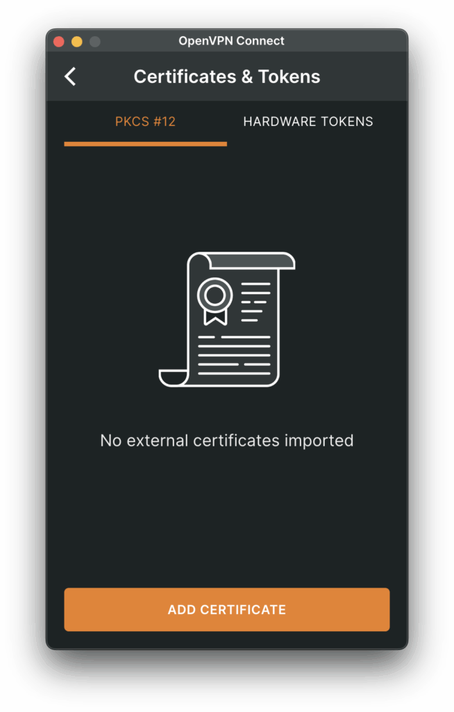 ADD CERTIFICATEボタンから証明書のアップロードができそうな雰囲気があるが、拡張子.p12の証明書ファイルしか受け付けない。HARDWARE TOKENS(鍵)に至っては追加するボタンらしきものもない。QNAP NASから前述でダウンロードしたZIPファイルの中身は拡張子.crtファイル(クライアント証明書)と.keyファイル(プライベートキー)で、互換性がない。