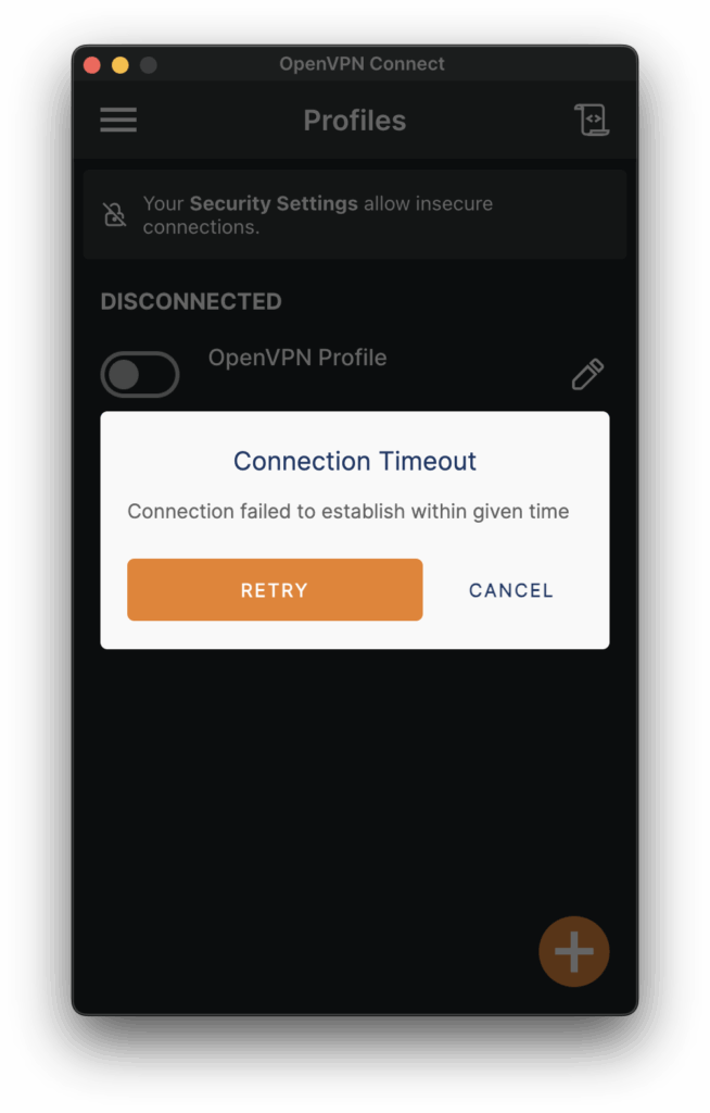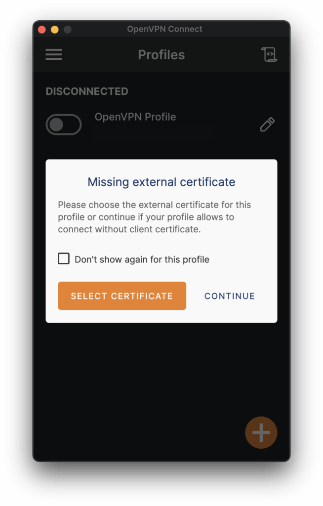 結論から言うと、SSL証明書を含む設定ファイルである.ovpnファイルを素のままアップロードしても、その接続プロファイルではVPN接続は出来ない。サーバーの証明書プライベート鍵がないからである。そして、通常の操作で証明書と鍵をアップロードする方法が現状ない。これはOpenVPN Connect for macOSの不具合なのかバグなのか、ソフトウェアの設計としては好ましくない。無料なので仕方ないか、といったところ。