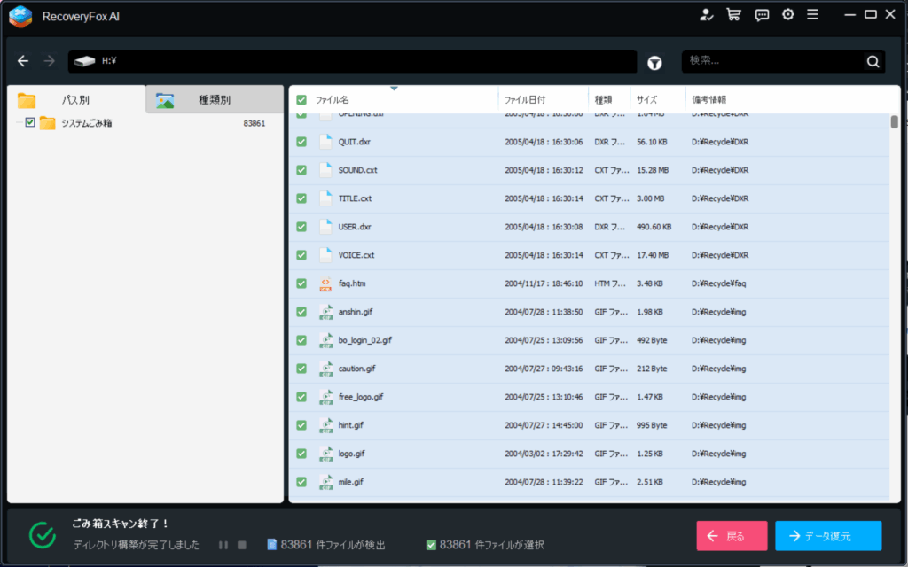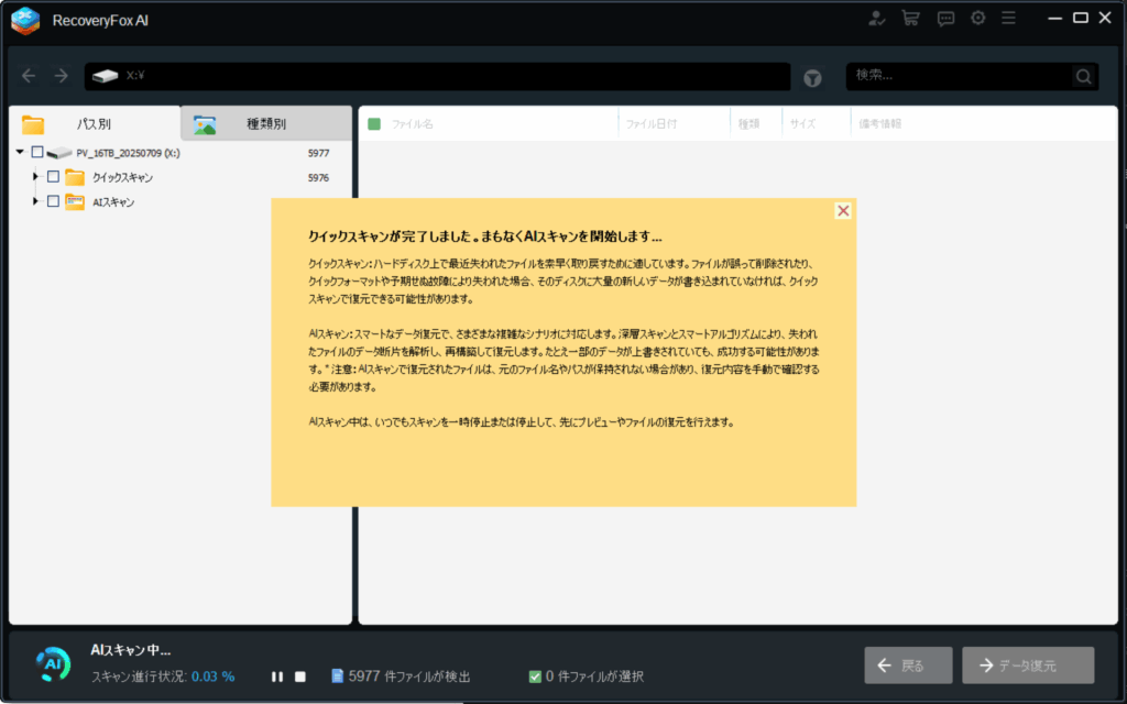 RecoveryFox AIは、この“残存データ”の検出と復元に特化したAIツールであり、誤削除や論理障害に対して高い復元能力を発揮する。無料版でも復元可能なファイルの一覧を確認できる点において、削除確認ツールとしての価値は極めて高い。