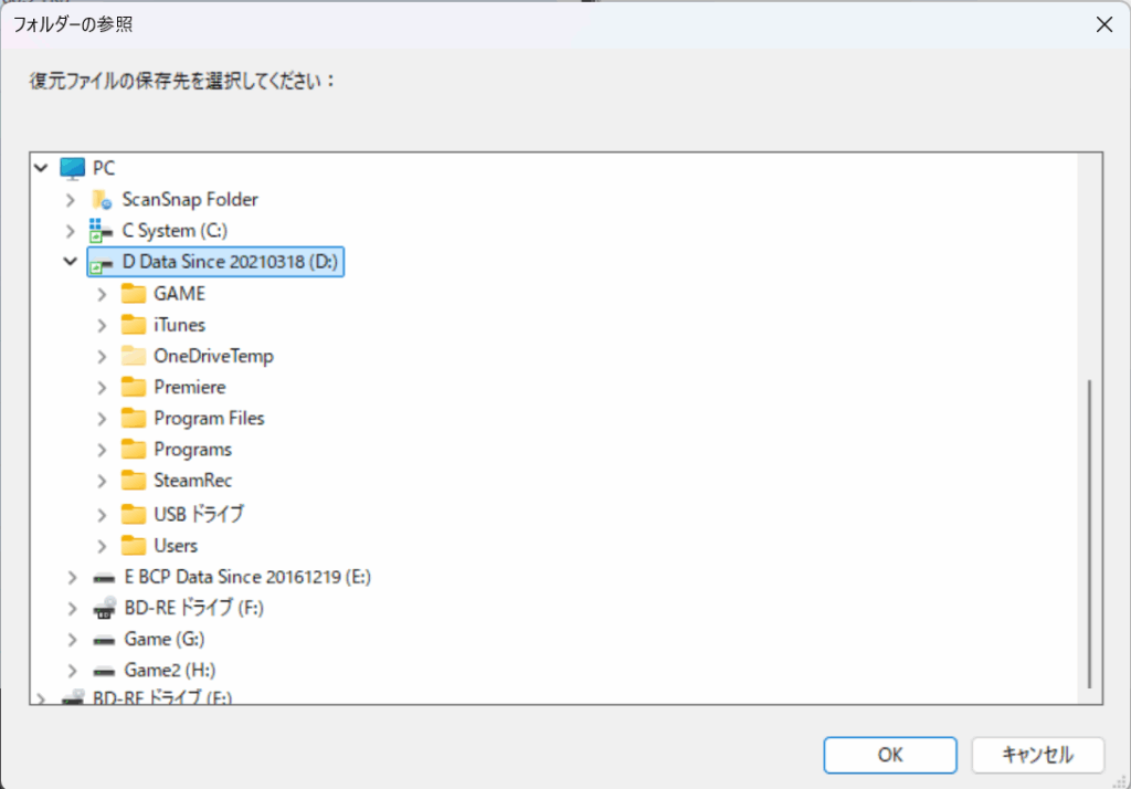 復元したファイルの保存先は、『ドライブ名のフォルダー(ドライブレター)』といった分かりやすい名前で生成される。