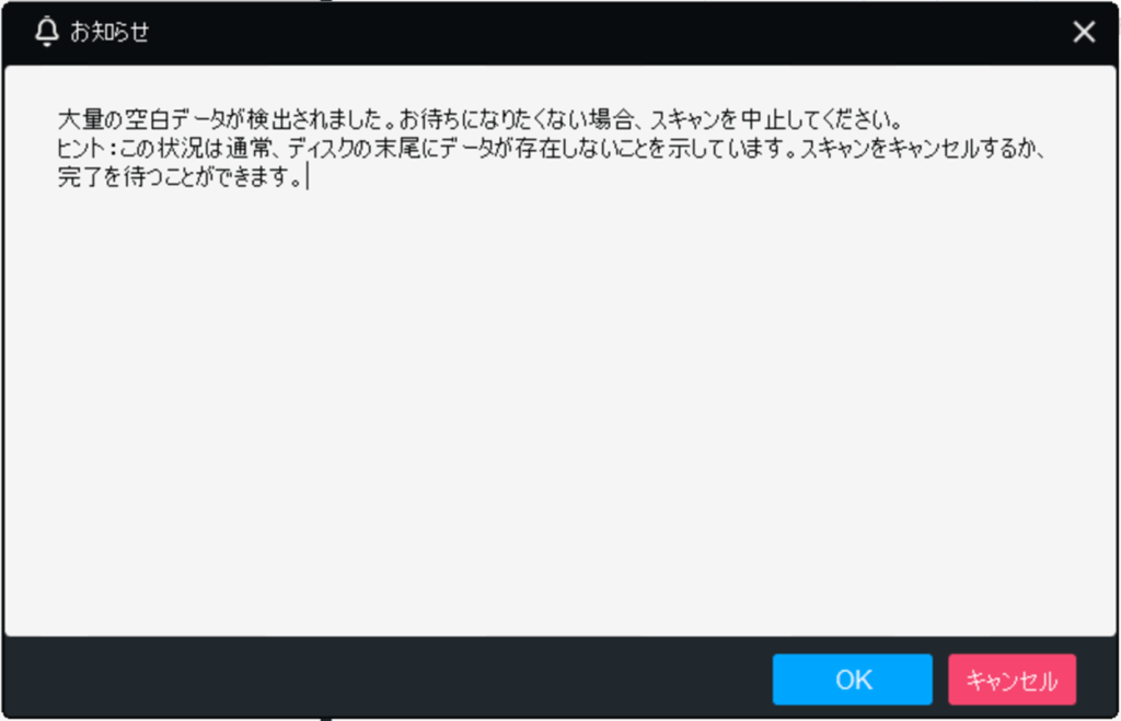 ゼロフィルが施されたディスクをスキャンした場合、AIスキャン開始1分、1%程で上記のようにアラートが出るので、無駄な走査の時間が省ける。これが表示されたら復元するデータは残っていない証拠である。