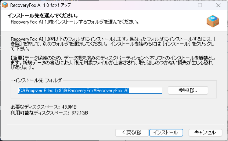 にインストールされる。もし、復元したいファイルがCドライブにある場合は、別のドライブにインストールしなければならない。消えたファイルが記録されたデータ領域をソフトウェアのデータで上書きして使ってしまえば復元できなくなるからだ。その場合はDドライブ等、使って問題ないディスクにプログラムをインストールしよう。