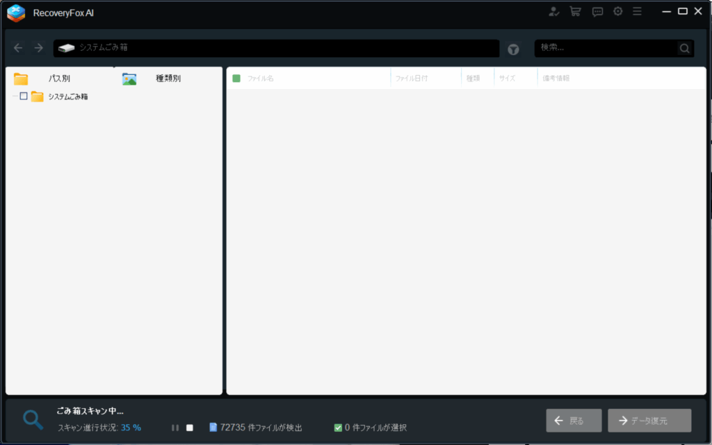 Windows PCに接続しているディスクがすべて表示される。今筆者の環境はゴミ箱が空のまっさらな状態である。Windowsではゴミ箱を空にしてもファイルが見えなくなるだけで、上書きされずにデータ領域が残っている場合、特殊なソフトウェアを使えば復元できる可能性がある。今回のRecoveryFox AIはこのWindows OSの仕組み、挙動を利用した復元・データ救出ツールである。ゴミ箱をクリックしてみた。